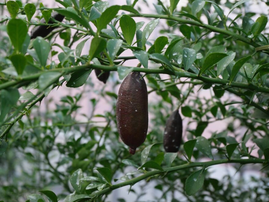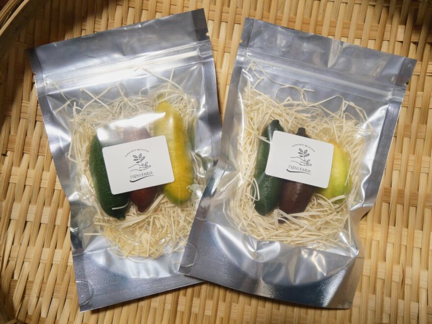 PIENI FARMが育てているのは、オーストラリア原産の香酸柑橘(こうさんかんきつ)「フィンガーライム」。 細長い果実の中にプチプチとした粒状の果肉がぎっしり詰まっており、カットすると黄色やピンク、赤など色とりどりの粒があふれ出します。その独特の見た目と食感から「森のキャビア」とも呼ばれ、国内では希少な高級果実です。