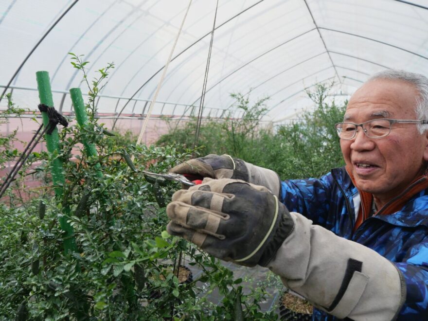 昨年はハウス内にアゲハ蝶が侵入し、卵から大量の幼虫が発生。その経験を生かし、今年は自作のカーテンでハウスの隙間をふさぎ、害虫の侵入を徹底的に防いでいるそうです。苗木の様子をよく観察し、適切なタイミングでの防除や施肥を行い、減農薬に努めています。